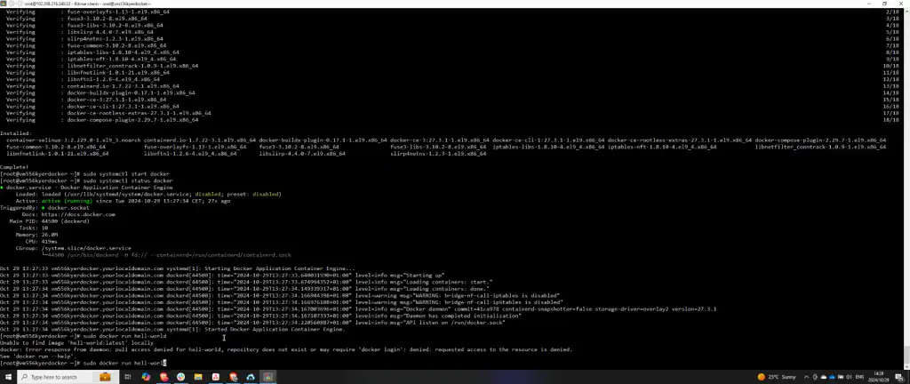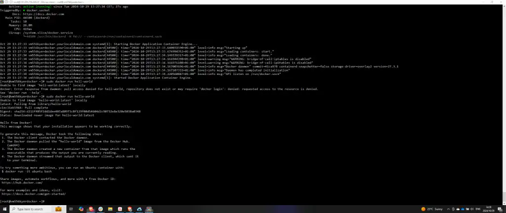 Once confirmed that Docker is active, test the installation by running a test container. Execute sudo docker run hello-world to ensure Docker is correctly set up and functioning.